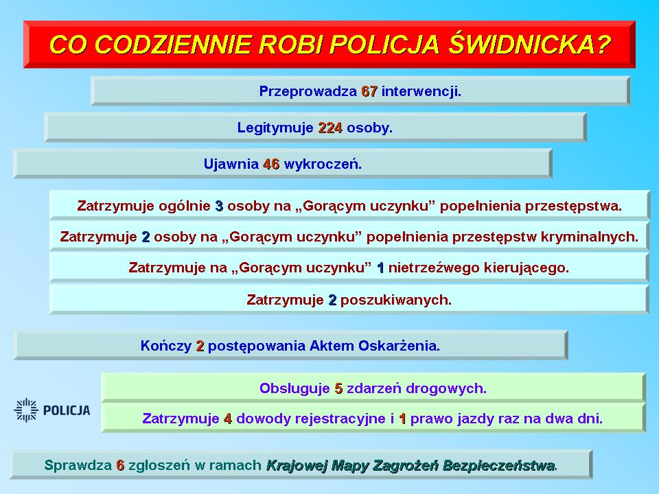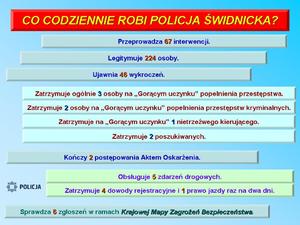 Komendant podając wyniki liczbowe zaznaczył, że na stan bezpieczeństwa mieszkańców powiatu wpływ miały również działania policjantów Wydziału Prewencji oraz Ruchu Drogowego świdnickiej jednostki, którzy przez cały rok prowadzili szereg działań zmierzających do poprawy bezpieczeństwa na drogach powiatu.