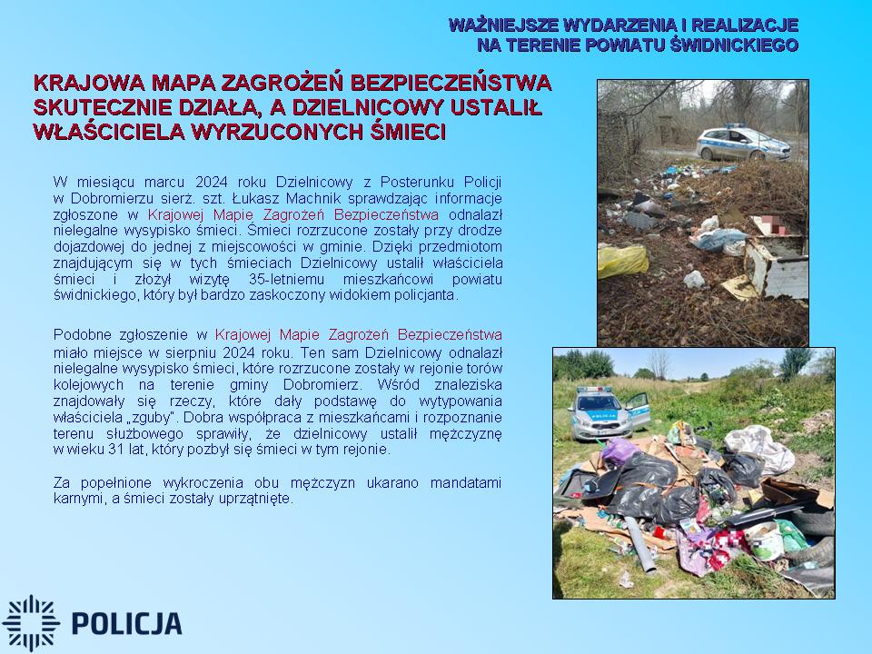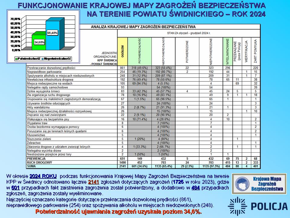 W okresie 2024 r. podczas funkcjonowania Krajowej Mapy Zagrożeń Bezpieczeństwa na terenie KPP Świdnicy odnotowano łącznie 2141 zgłoszeń, gdzie w 601 przypadkach fakt zaistnienia zagrożenia został potwierdzony, a dodatkowo w 401 przypadkach zgłoszeń, zagrożenia zostały wyeliminowane. Najczęściej oznaczano kategorie dotyczące przekraczania dozwolonej prędkości (861), nieprawidłowego parkowanie (254) oraz niewłaściwej infrastruktury drogowej (248).