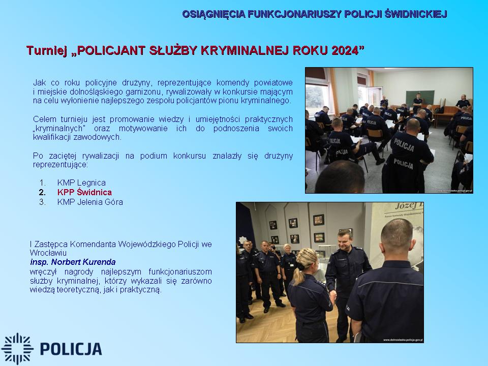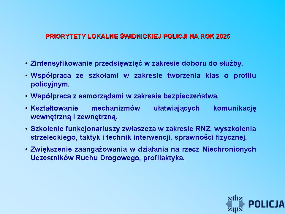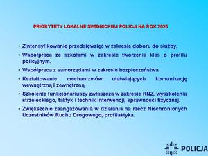 Głos zabrał także Zastępca Komendanta Wojewódzkiego Policji we Wrocławiu inspektor Krzysztof Kumaszka, który podkreślał wysokie standardy jakości pracy świdnickiej policji. Podziękował funkcjonariuszom za wkład w zakresie podnoszenia poziomu bezpieczeństwa mieszkańców Dolnego Śląska oraz przestawił priorytety policji dolnośląskiej na rok 2025.