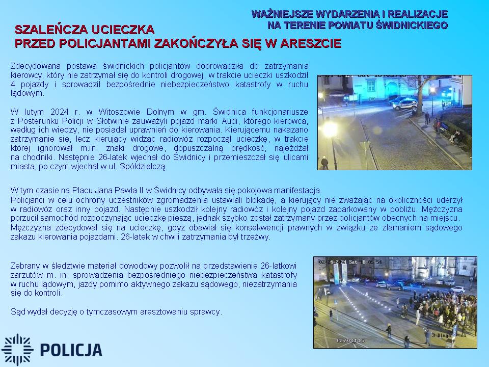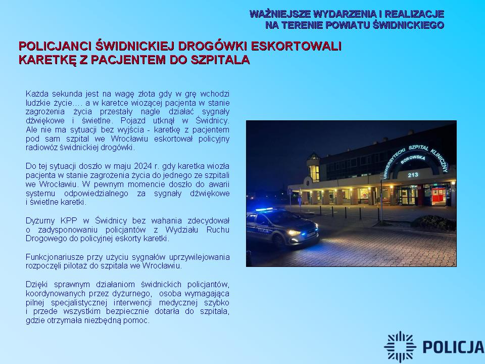 Ubiegły rok to dla policji świdnickiej przede wszystkim podniesienie wysokiego już poziomu skuteczności co przekłada się na codzienną służbę. Działania policjantów zarówno te wojewódzkie, jak i te własne ukierunkowana na bezpieczeństwo mieszkańców pozwoliły wyeliminować z dróg aż 164 nietrzeźwych kierujących. Na drogach powiatu świdnickiego w 2024 roku odnotowano 136 wypadków drogowych, w których rannych zostało 186 osób, a śmierć niestety poniosło aż 9 osób. Na drogach powiatu świdnickiego w 2024 roku odnotowano 1629 kolizji drogowych.