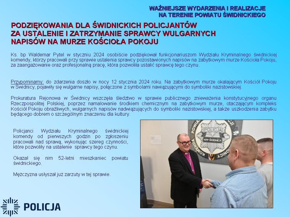 Komendant świdnickiej jednostki pozytywnie ocenił także współpracę z samorządowcami i podziękował za pomoc przy modernizacji sprzętu policyjnego oraz za wsparcie w podnoszeniu jakości pracy policjantów.