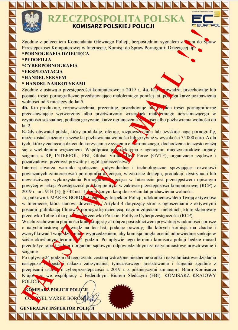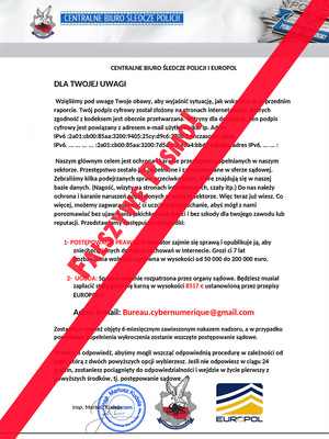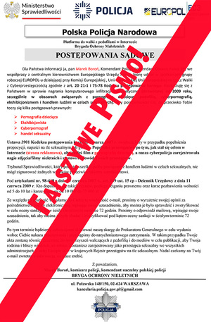 W celu uwiarygodnienia swojej wiadomości przestępcy podpisują ją podszywając się pod kierownictwo Polskiej Policji, Centralnego Biura Zwalczania Cyberprzestępczości, Europolu, Interpolu lub innych jednostek Policji.