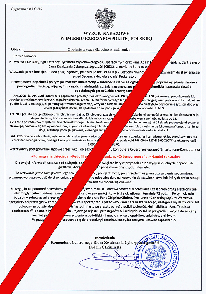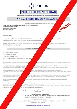 Do wysyłanych przez oszustów wiadomości jest załączony dokument w formacie „pdf”. Z jego treści wynika, że osoba, która jest adresatem wiadomości jest podejrzana o dokonanie przestępstw pedofilskich i jest zobowiązana do udzielenia odpowiedzi.