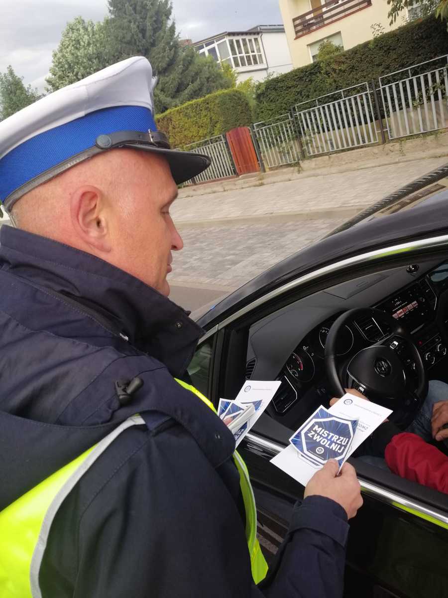 Policjanci Wydziału Ruchu Drogowego Komendy Powiatowej Policji w Świdnicy włączyli się w ogólnopolską akcję profilaktyczną „Mistrzu, zwolnij!”. W ramach działań funkcjonariusze rozdawali kierowcom ulotki oraz rozmawiali z nimi o bezpieczeństwie na drogach.