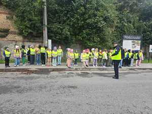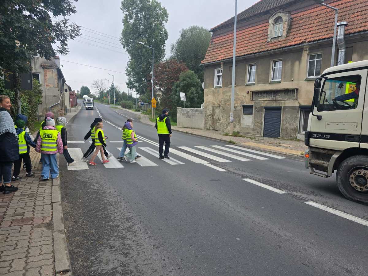 Druga cześć spotkania to już zajęcia praktyczne, uczniowie w asyście policjanta uczyli się jak bezpiecznie poruszać się po drodze, w jakich miejscach przechodzić przez jezdnie nie stwarzając tym samym zagrożenia dla innych uczestników ruchu drogowego.