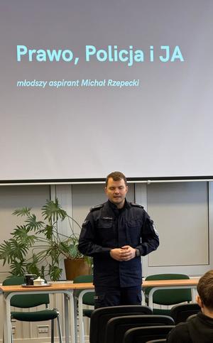 Podczas spotkania policjant przybliżył młodzieży zagadnienia związane z funkcjonowaniem Policji, podstawowymi zasadami prawa oraz odpowiedzialnością prawną osób nieletnich i pełnoletnich.