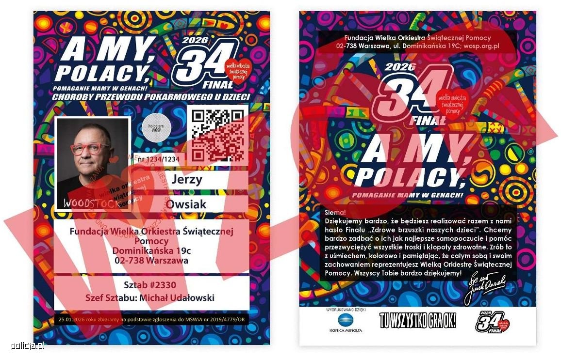 - W przypadku jakichkolwiek podejrzeń, że ktoś podszywa się pod wolontariusza WOŚP, nie posiada identyfikatora lub jego puszka wygląda inaczej niż standardowa, prosimy o niezwłoczny kontakt z Policją. Każda informacja dotycząca podejrzanych zachowań może pomóc zadbać o bezpieczeństwo wolontariuszy i uczestników finału.