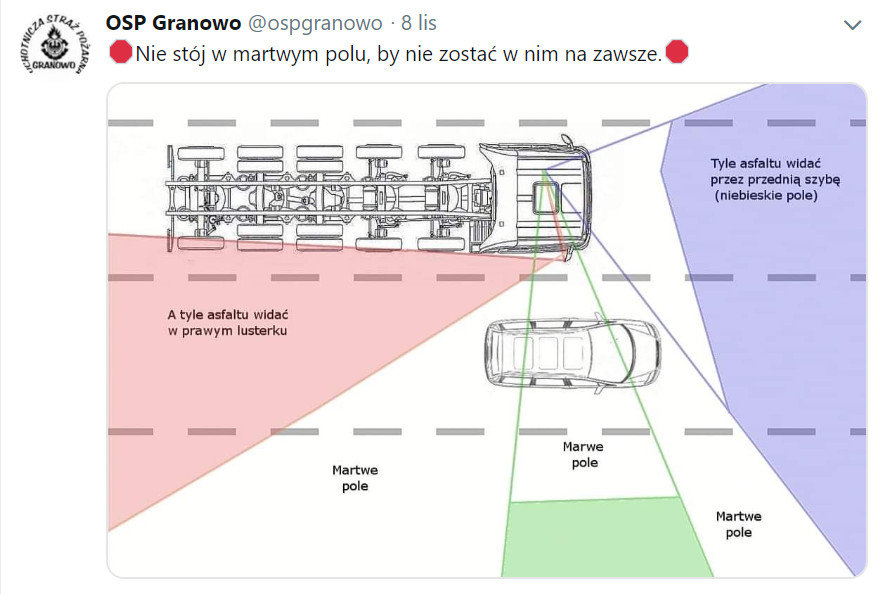 Natomiast kierowcy jadący samochodem osobowym jadąc obok ciężarówki na drodze o dwóch pasach ruchu czy wyprzedzając ją, powinni przez jak najkrótszy czas pozostawać w martwym polu jej kierowcy, wszystko to dla bezpieczeństwa.